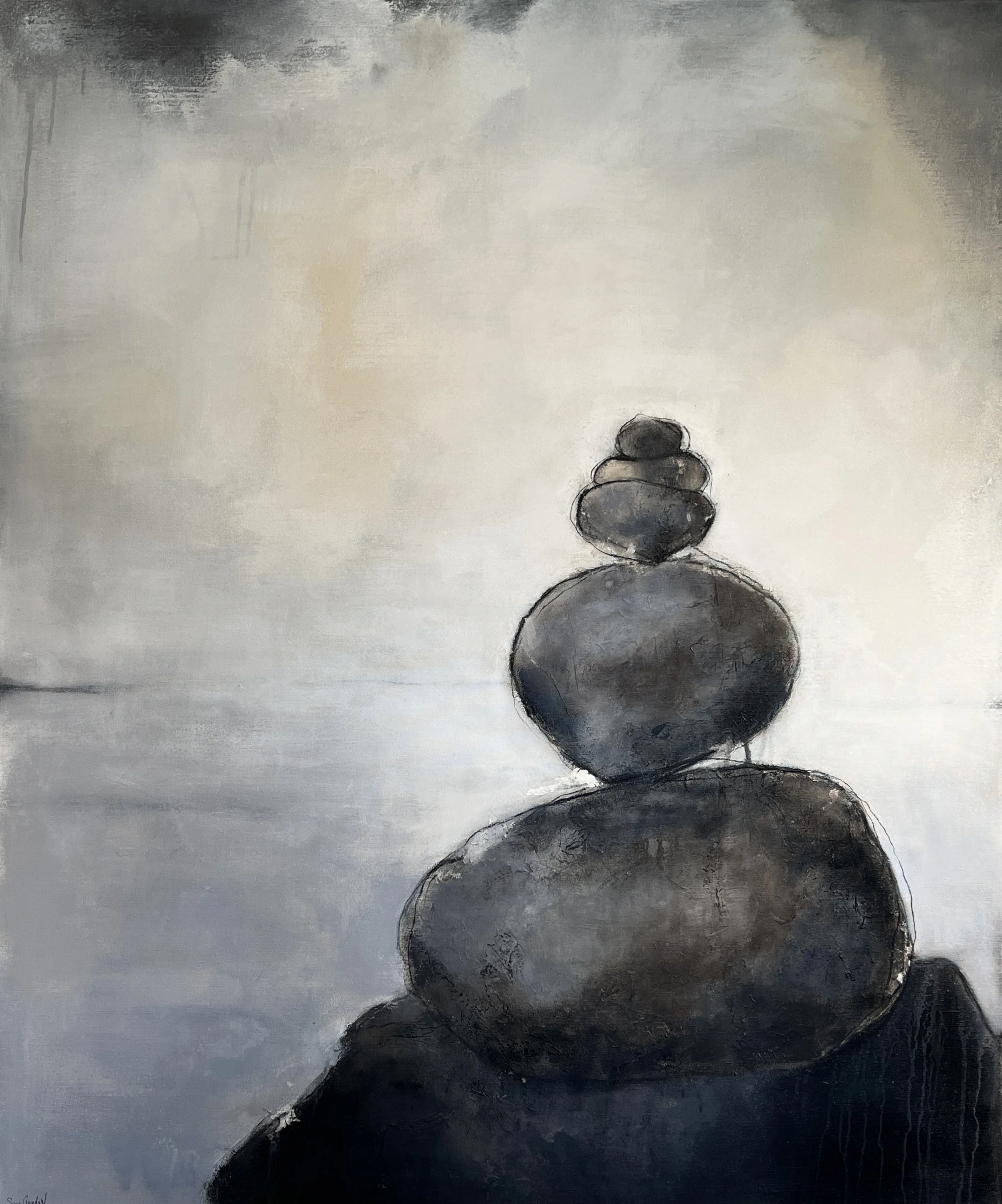 Mine malerier kan beskrives som både minimalistiske og ekspressive – de kredser om spændingsfeltet mellem kontrast og harmoni. Det reducerede farvevalg giver plads til nuancer i tekstur, de mange lag der danner fladen og og selvfølgelig lyset, mens de udvalgte farveelementer bryder fladen og skaber emotionelle nedslag, som inviterer beskueren til fordybelse.